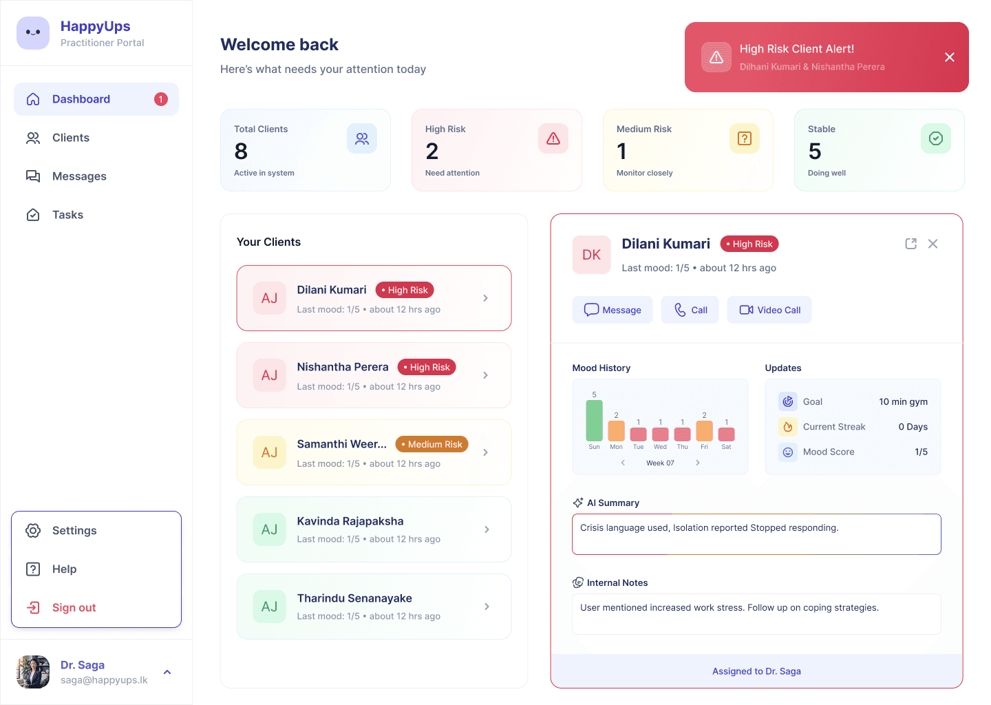 The operations dashboard enables the team to monitor user activity and identify high-risk cases. It supports messaging, calls, and timely intervention based on priority levels. An admin view allows management of team members and workload assignment.