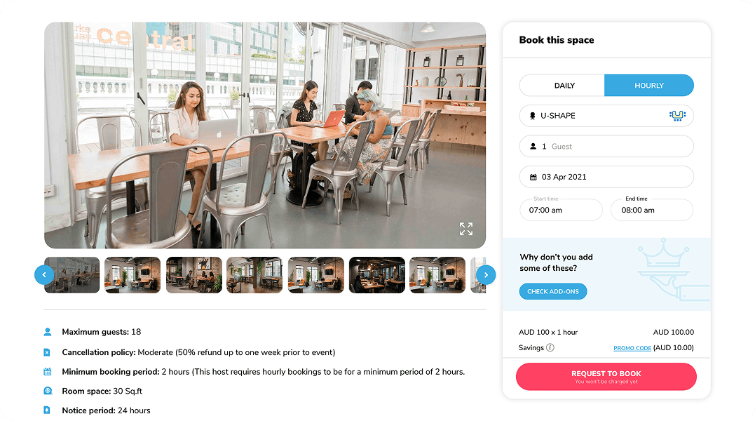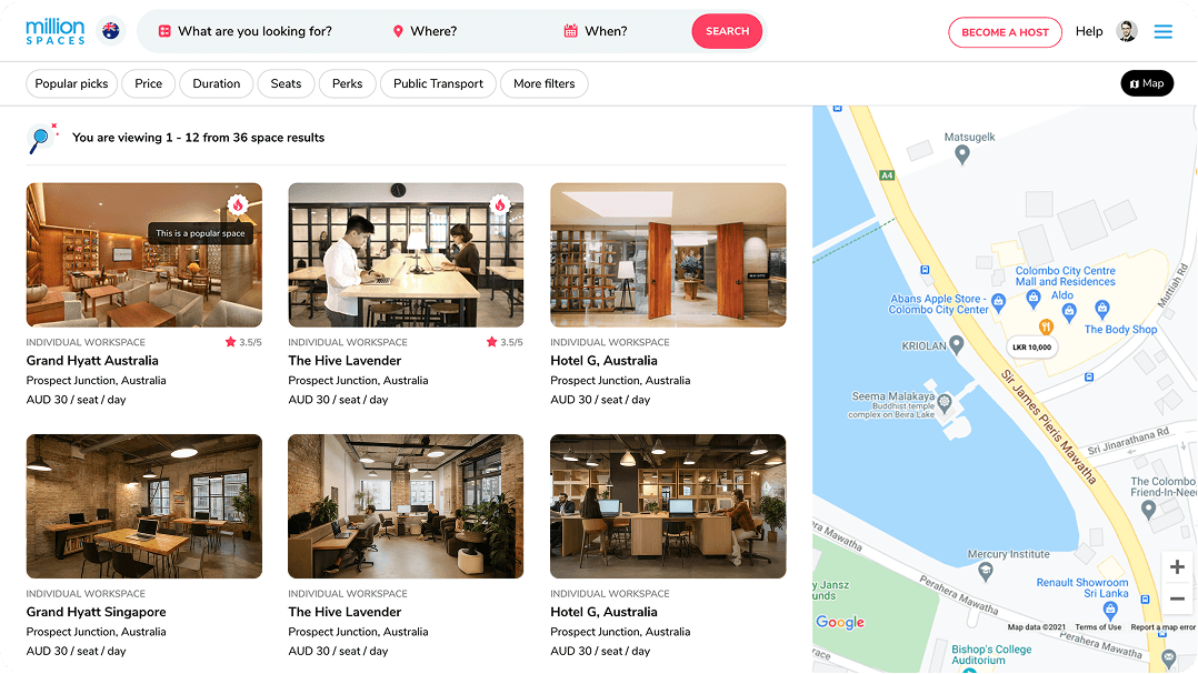 Automatically adapts the home screen to users in Singapore, Sri Lanka, or Australia based on their IP address showing relevant spaces, currency, and offers.