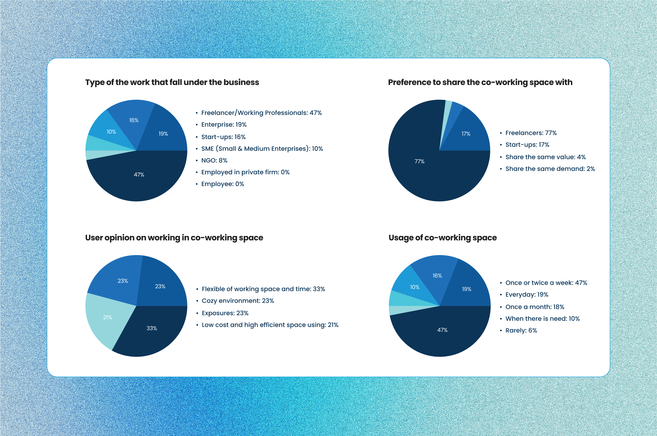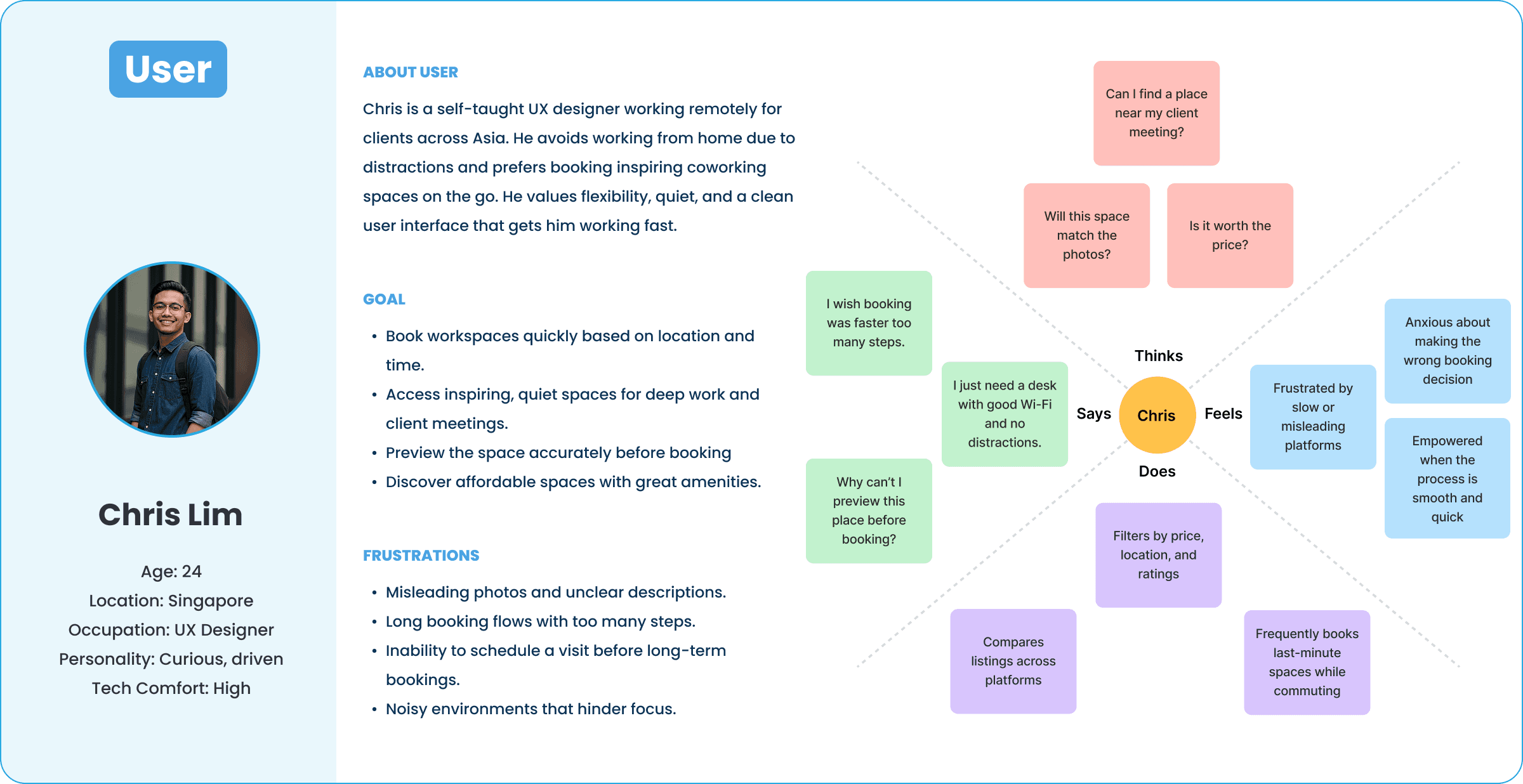 Qualitative Research: We conducted one-on-one interviews with freelancers and remote professionals in Singapore and Sri Lanka to explore their coworking habits and challenges. Users emphasized the need for flexibility, better space authenticity, and more transparent booking systems. Many were frustrated by misleading photos, rigid booking flows, and lack of privacy in open spaces.