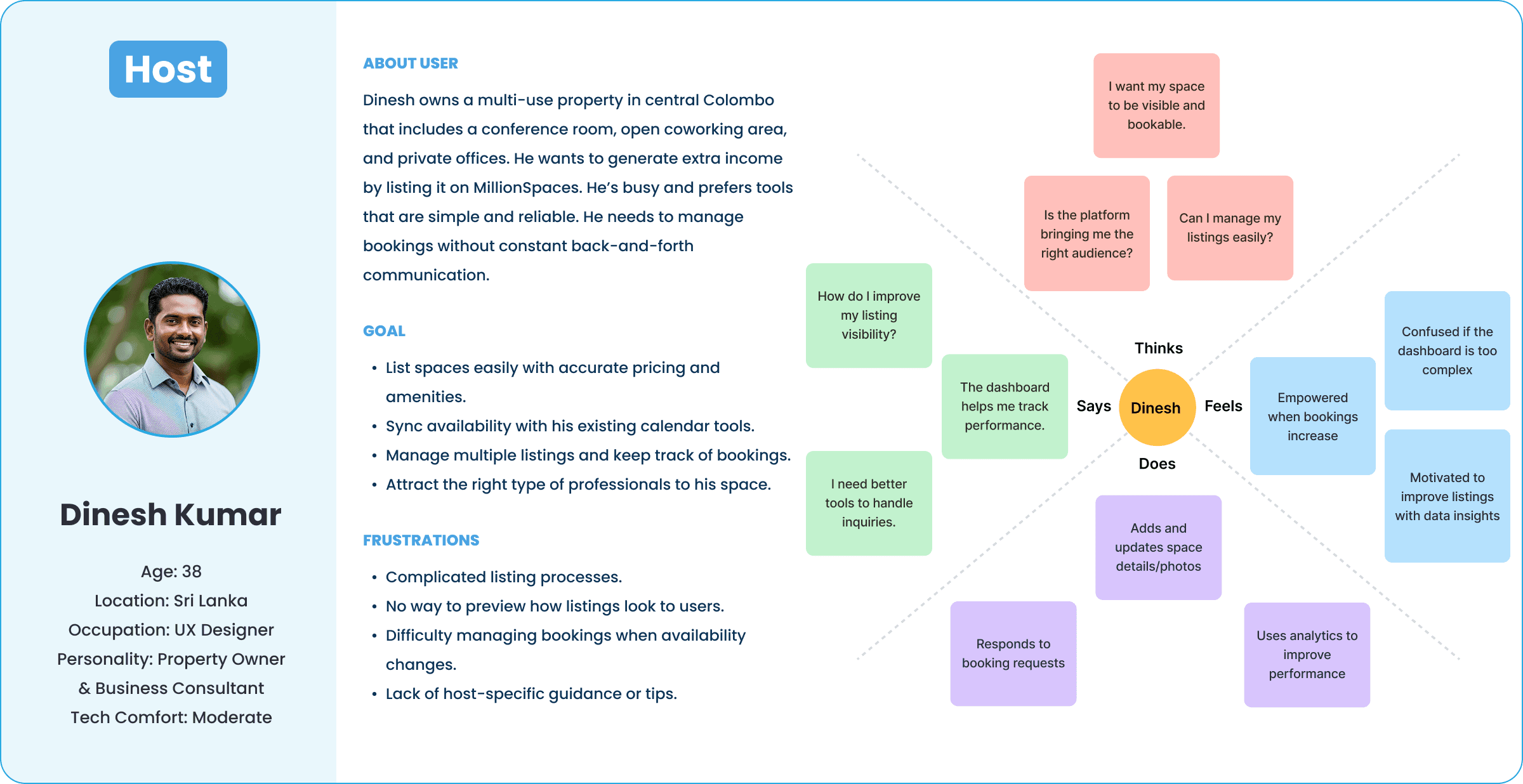 MillionSpaces is a platform that connects users looking to book workspaces with hosts who want to list their available spaces. From meeting rooms to training halls and coworking hubs, the platform provides flexibility, transparency, and ease for both ends of the market. I joined the project as the sole UX designer, working across research, ideation, prototyping, and handoff to developers.