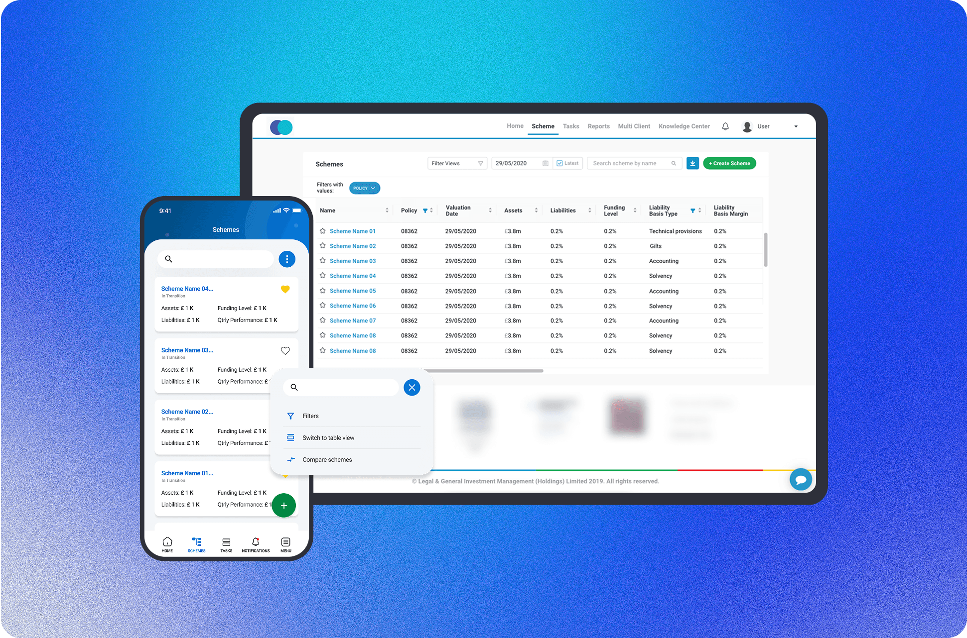 A centralized interface that displays all pension schemes in a customizable table view. Users can apply over 20 filters, search schemes by name or attribute, and access detailed scheme information all designed for quick navigation and data visibility.